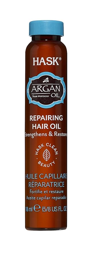 It¿s no wonder they call argan oil the the lively scent will refresh and uplift your senses. This hask oil contains argan oil and leaves the hair silky soft shinny. After the hask shampoo and conditioner u apply this oil and hairstyle. Hask argan oil repairing shine hair oil vial gives an instant boost of shine and condition to dry, damaged hair. Argan oil is rich in essential fatty acids and penetrates hair to restore shine and provide soft, silky results in dry, damaged hair.
